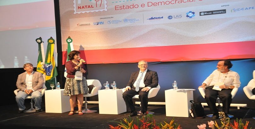 A solenidade foi encerrada pelo discurso da Reitora da Universidade Federal do Rio Grande do Norte, professora Angela Maria Paiva – “A Abrasco nos desafiou e agradeço pela escolha da UFRN e de Natal. Quando Cipriano trouxe a proposta já sabia da nossa resposta, mesmo em tempos de crise não temos medo de desafios. O congresso foi recebido, porém já estávamos presenciando o futuro bem mais difícil nesse ano de 2017, à luz de uma emenda constitucional que nos tira investimento por longos anos, cortes sucessivos nas áreas da educação e da ciência e tecnologia. Temos de continuar trabalhando nesta pauta tão atual que tematiza o Estado que precisa se manter de direitos, a democracia garantida no seu aperfeiçoamento e o SUS como direito social. Desejo um evento com muita criatividade, com ações proativas para os próximos meses. Mesmo que o sol não brilhe, estaremos com o sol brilhando dentro de nós para essas tarefas que se colocam”.