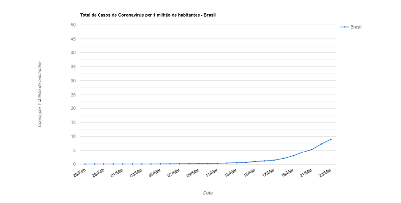 A plataforma também permite uma comparação mais detalhada entre os estados, através do gráfico do número de casos por milhões de habitantes (abaixo) e o gráfico da taxa de mortalidade – que ainda está em preparo: “O gráfico de São Paulo [abaixo] , por exemplo, pode dar uma ideia se vamos conseguir achatar a curva e o quanto ela será achatada. Como a epidemia nos outros estados ocorrerá duas a três semanas mais tarde do que em São Paulo, essa é uma informação importante para dimensionar os serviços de saúde. Evidentemente, São Paulo, por ter uma população maior, vai ter um maior número de casos em números absolutos, mas ao vermos quantos casos por milhões de habitantes identificaremos semelhanças e diferenças na evolução da epidemia nos estados, considerando o tamanho da população. Essa informação pode servir de subsídio para projetar número de casos nos diferentes momentos da epidemia”.