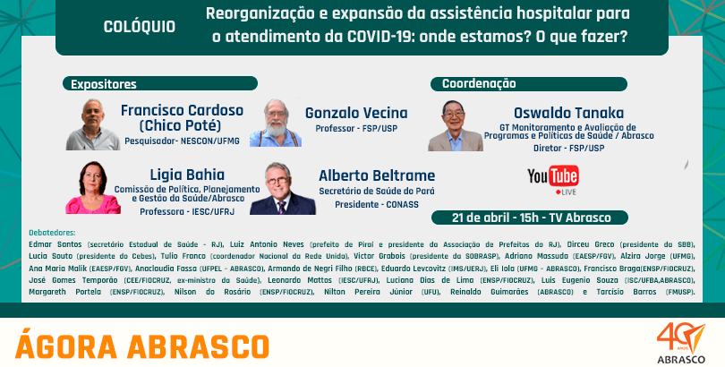 Reorganização e expansão da assistência hospitalar para o atendimento da Covid-19: onde estamos? O que fazer? é o título do colóquio de terça-feira, dia 21. A coordenação será de Oswaldo Tanaka, diretor da Faculdade de Saúde Pública da Universidade de São Paulo (FSP/USP) e integrante do Grupo Temático em Avaliação e Monitoramento de Serviços e Programas de Saúde (GT Monitoramento/Abrasco), e contará com as exposições de Alberto Beltrame, secretário de saúde do Estado do Pará (PA) e presidente do Conselho Nacional dos Secretários de Saúde (CONASS); Francisco Cardoso, o Chico Poté, pesquisador do Núcleo de Educação em Saúde Coletiva, da Universidade Federal de Minas Gerais (NESCON-UFMG); Gonzalo Vecina, docente também da FSP/USP, e Lígia Bahia, líder do Grupo de Pesquisa e Documentação sobre Empresariamento na Saúde, da Universidade Federal do Rio de Janeiro (GPDES-IESC/UFRJ).