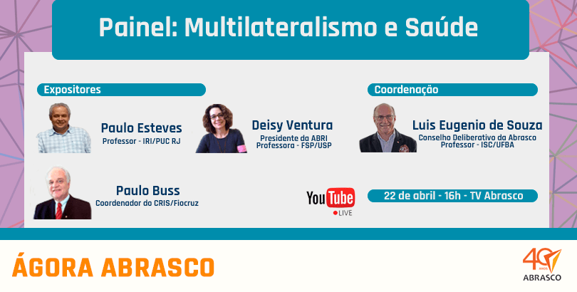 Na quarta-feira, dia 22, às 16 horas, será a vez do painel Multilateralismo e saúde, organizado pelo Comitê Assessor de Relações Internacionais da diretoria da Associação (CARI/Abrasco). A condução dos trabalhos estará a cargo de Luis Eugenio de Souza, professor do Instituto de Saúde Coletiva da Universidade Federal da Bahia (ISC/UFBA), presidente da Abrasco entre 2012 – 2015 e coordenador do CARI/Abrasco . Os expositores convidados são Paulo Esteves, professor do Instituto de Relações Internacionais da Pontifícia Universidade Católica do Rio de Janeiro (IRI/PUC-RJ), Deisy Ventura, docente da FSP/USP e presidente da Associação Brasileira de Relações Internacionais (ABRI), e Paulo Buss, coordenador do Centro de Relações Internacionais em Saúde, da Fundação Oswaldo Cruz (Cris/Fiocruz).
