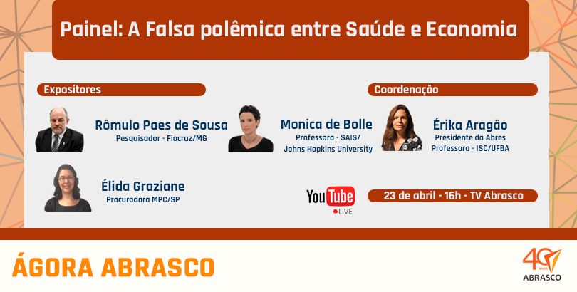 Esta semana será dose dupla de painéis, com A falsa polêmica entre saúde e economia programado para quinta-feira, dia 23, às 16 horas. Com coordenação de Erika Aragão, docente do ISC/UFBA e presidente da Associação Brasileira de Economia da Saúde (ABrES), o painel terá a participação de Rômulo Paes de Souza, pesquisador do Instituto René Rachou (IRR/Fiocruz Minas); Monica de Bolle, professora da School of Advanced International Studies (SAIS), da Johns Hopkins University; e Élida Graziane, professora da Escola de Administração de Empresas da Fundação Getúlio Vargas (EAESP-FGV) e procuradora do Ministério Público de Contas do Estado de São Paulo (MPC-SP).