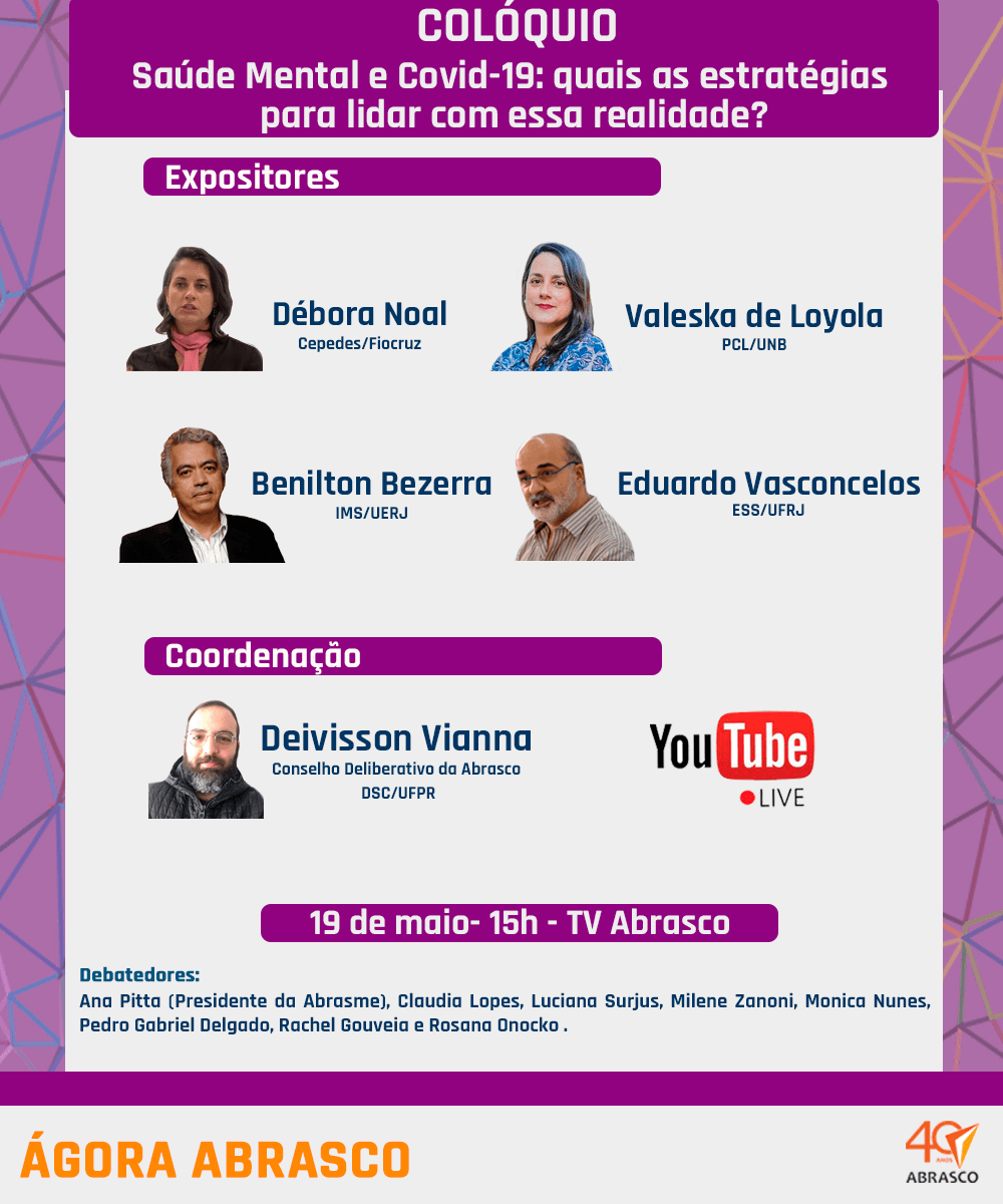 A sétima semana da Ágora Abrasco se inicia em meio a um país devastado: são mais de 16 mil pessoas mortas em decorrência do coronavírus. As discussões acompanham o agravamento da pandemia e seus impactos sobre a saúde, a vida e morte da população brasileira. A programação desta semana traz o colóquio Saúde Mental e Covid-19: quais estratégias para lidar com essa realidade?, que reunirá pesquisadores de diferentes frentes da psicologia, psicanálise e psiquiatria, e o painel Invisibilidades e iniquidades na Amazônia: povos indígenas e a Covid-19, com lideranças indígenas e especialistas. #FicaemCasa e acompanhe a TV Abrasco: