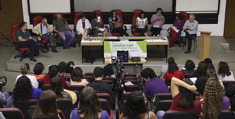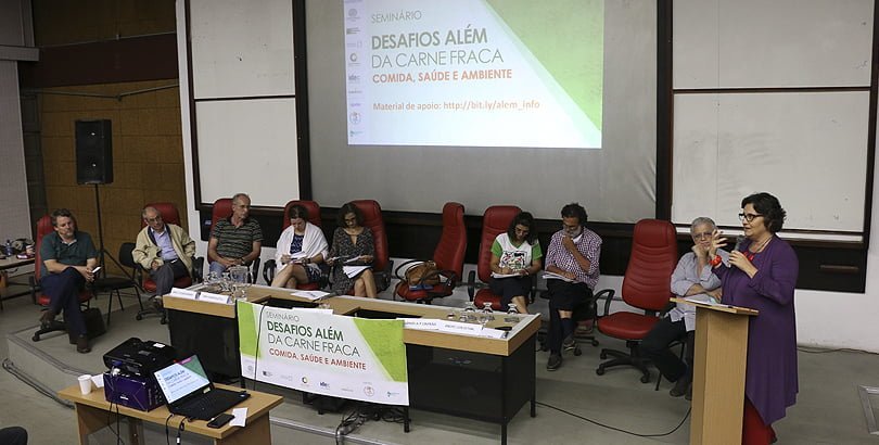 O Seminário “Desafios Além da Carne Fraca: comida, saúde e ambiente”, que aconteceu no dia 18 de abril, na Universidade do Estado do Rio de Janeiro (UERJ), discutiu as questões amplas e profundas que não apareceram nos noticiários no Brasil, quando vieram a público os resultados da Operação Carne Fraca, deflagrada pela Polícia Federal no dia 17 de março. Pesquisadores se reuniram para apresentar e debater questões como o processo produtivo da carne, o trabalho, a economia, o direito dos animais, a alimentação saudável e a não-saudável, a saúde da população, a vigilância sanitária e o Sistema Único de Saúde, a degradação ambiental. Inês Rugani, coordenadora do GT Alimentação e Nutrição em Saúde Coletiva da Abrasco, e Eduardo Faerstein, coordenador do Comitê de Relações Internacionais da Abrasco, organizadores do evento, afirmaram que apenas por meio da combinação dos campos da Saúde Coletiva, Agronomia, Economia, Engenharia, Jornalismo, Nutrição, Bioquímica e Ciências Sociais foi possível compreender e agir sobre os complexos processos, interligados, que determinam e influenciam a alimentação humana. “Além dos 12 moderadores, palestrantes e debatedores, um time considerável de técnicos, alunos e docentes envolveu-se em numerosas providencias para produção e apoio operacional. Além do apoio, inclusive financeiro, das entidades co-promotoras (Abrasco, Centro Brasil de Saúde Global, Idec, Aliança pela Alimentação Adequada e Saudável), houve decisivo apoio institucional na UERJ por parte da Reitoria, Direções e coordenações de pós-graduação dos Institutos de Nutrição e Medicina Social; Telessaude, CTE/SR3, Prefeitura do campus e Comunicação/Abrasco garantiram a gravação, transmissão online e documentação do evento; Abrasco/Livros esteve presente, com obras relacionadas ao tema”, ressaltaram.