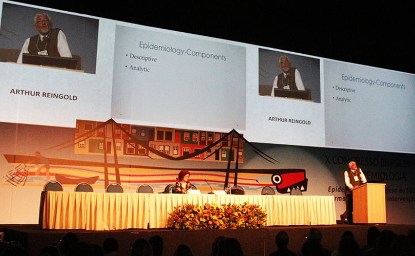 Arthur Reingold é médico e não possui doutorado, o que não o impediu de presidir sessões com as maiores autoridades sanitárias e científicas do planeta, apoiado num vasto conhecimento epidemiológico, na humildade e em aforismos futebolísticos – no caso, do baseball. “Tinha um grande apanhador dos New York Yankees, o Yogi Berra, famoso por suas frases de efeito sem nenhuma lógica formal. Elas me acompanham e servem para pensar a epidemiologia e o papel da ciência. É importante saber que “você pode observar coisa à beça apenas vendo-as”, disse ele com um largo sorriso iluminado pelo telão que estampava a frase original. Foi dessa forma leve e segura que o professor e chefe do Departamento de Epidemiologia da Escola de Saúde Pública da Universidade da Califórnia – Berkeley fez duas importantes participações no X Congresso Brasileiro de Epidemiologia. O docente abriu o dia 10 de outubro com a conferência “Ensinando Epidemiologia: métodos, mesmo sofisticados, não são suficientes” e participou, à tarde, da mesa-redonda “A perspectiva epidemiológica sobre os movimentos anti-vacina”. Ao melhor estilo ‘ao mestre com carinho’, ex-alunos e amigos concederam-lhe uma bela homenagem pelo apoio e cooperação junto à comunidade científica brasileira.