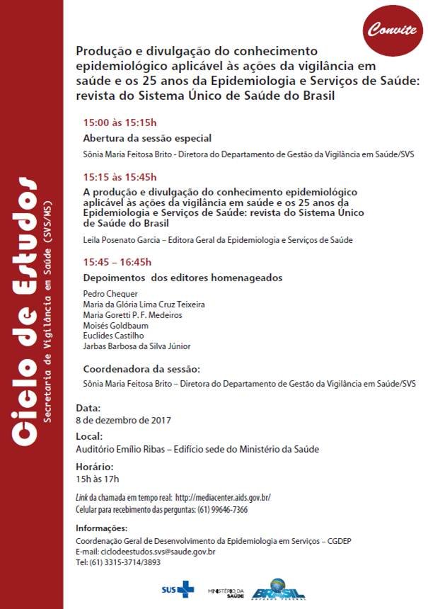 Em celebração aos 25 anos da Revista Epidemiologia e Serviços de Saúde (RESS), o Ciclo de Estudos da Secretaria de Vigilância em Saúde, do Ministério da Saúde (SVS/MS) prepra uma edição especial da atividade nesta sexta-feira, 08 de dezembro, em Brasília.