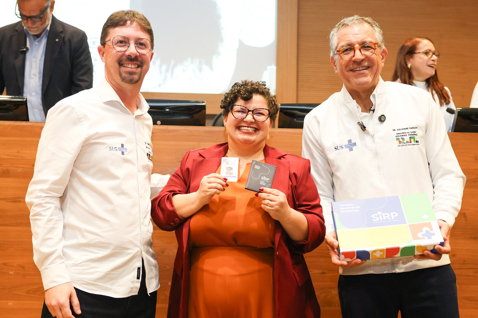 Rio de Janeiro – Ato de entrega dos primeiros registros profissionais de sanitaristas. A pesquisadora Indyara Morais recebe do secretário Felipe Proenço e do ministro da Saúde, Alexandre Padilha, sua carteira de sanitarista. Fotos: Walterson Rosa/MS