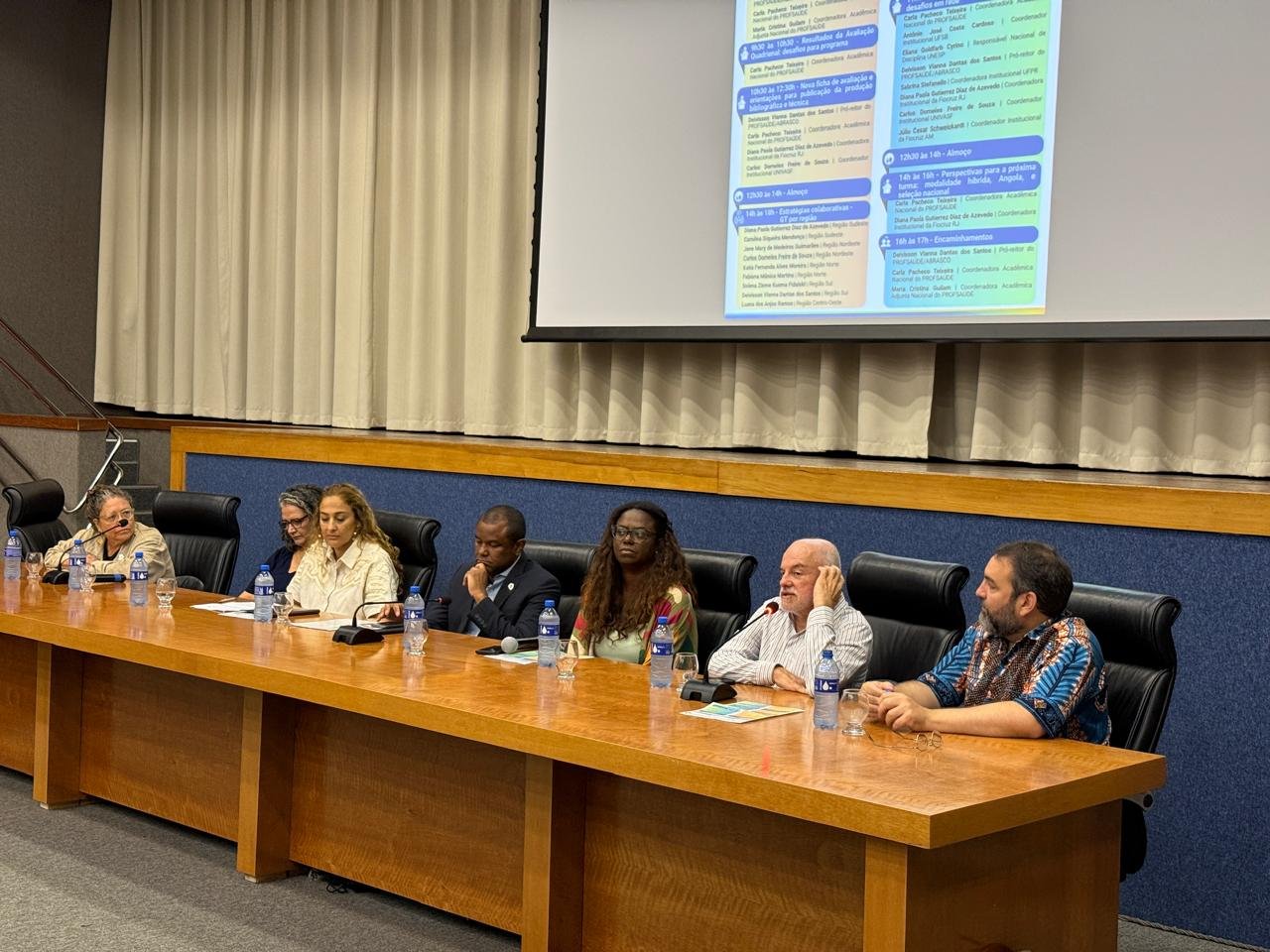 A programação teve início com a mesa de abertura, que contou com a participação de representantes do Ministério da Saúde, da Fiocruz, da Abrasco e de instituições de ensino parceiras. Entre os participantes estiveram Jerzey Timoteo Ribeiro Santos, secretário adjunto de Gestão do Trabalho e da Educação na Saúde do Ministério da Saúde; Fabiano Ribeiro dos Santos, diretor do Departamento de Gestão da Educação na Saúde (DEGES/SGETS); Simone Benck, reitora da UNDF; Mariana Souza, da Fiocruz; Rômulo Paes, presidente da Abrasco; Deivisson Vianna Dantas dos Santos, pró-reitor do PROFSAÚDE/Abrasco; além das coordenadoras acadêmicas nacionais Carla Pacheco Teixeira e Maria Cristina Guilam.