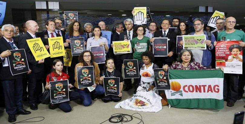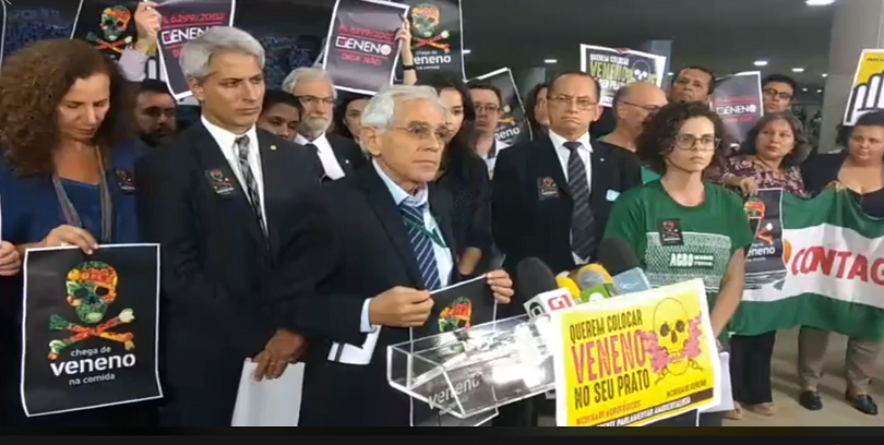 Na tarde desta terça-feira, 15 de maio, a Abrasco engrossou o coro contra o Pacote do Veneno, num ato na Câmara que reuniu diversas entidades e deputados. O sanitarista abrasquiano Geraldo Luchese, integrante do Grupo Temático Vigilância Sanitária (GTVISA/Abrasco) representou a Associação em Brasília na tentativa de evitar mais este retrocesso, entidades ligadas ao tema e parlamentares denunciaram a celeridade da votação do texto na comissão especial e pedir a votação do PL 6670/16, que institui a Política Nacional de Redução de Agrotóxicos. O grupo, no entanto, não foi recebido pelo presidente da Câmara, deputado Rodrigo Maia (DEM-RJ).