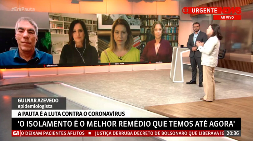 Em mais uma participação ao vivo e em estúdio no canal GloboNews, Gulnar Azevedo e Silva, presidente da Abrasco, fez um chamamento público às autoridades e à sociedade civil para que todas e todos se articulem em torno da ciência e da Saúde Coletiva nas ações necessárias à resposta à pandemia da Covid-19. Gulnar esteve na noite de 27 de março no telejornal Em Pauta e dialogou com o apresentador, Marcelo Cosme, e com os comentaristas Demétrio Magnoli, Monica Waldvogel, Eliane Catanhedê e Carolina Cimenti.