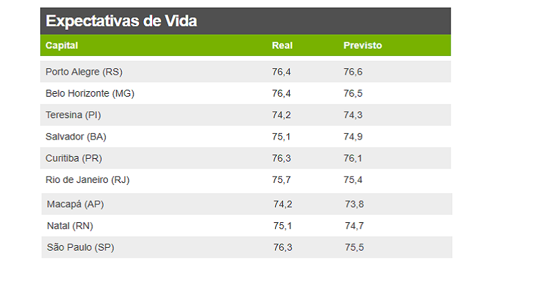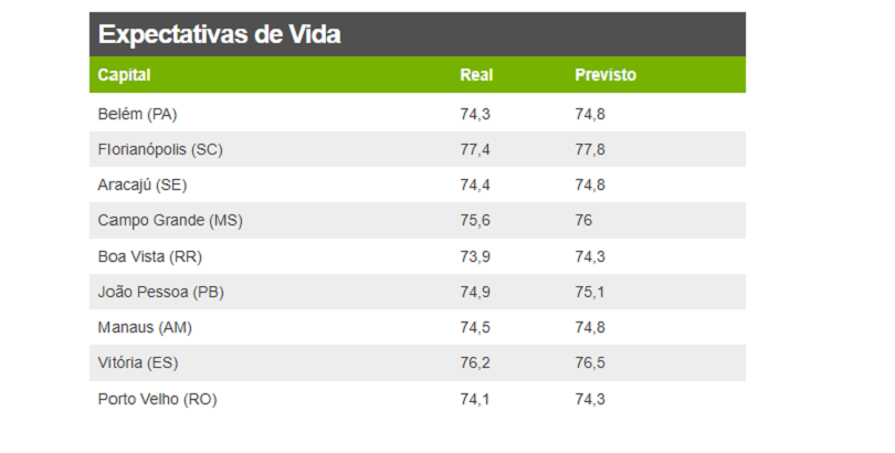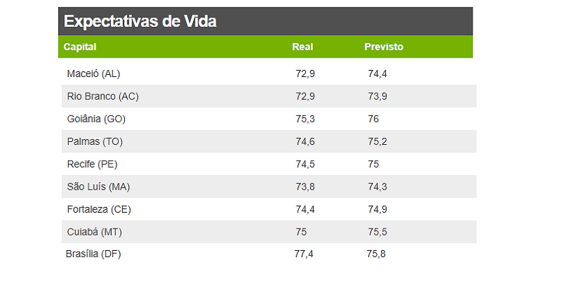 De acordo com a pesquisa, Joaquim Nabuco, município pernambucano com 16 mil habitantes, apresenta cerca de quatro anos a menos do que se estimava. Considerando as variáveis socioeconômicas, a população nabuquense deveria viver até os 69,7 anos, mas chega, em média, aos já citados 65,5 anos. Na extremidade oposta, Alto Alegre, em Roraima, também rondando os 16 mil habitantes, tem uma expectativa calculada de 70. Os alto-alegrenses costumam aniversariar até os 73,7 anos, em média.