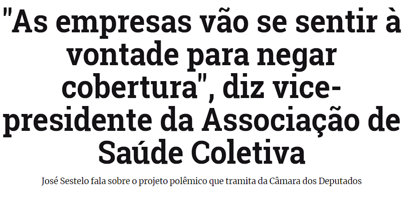 José Sestelo: A nossa visão é que o projeto tem um viés claramente favorável ao interesse das empresas. A coisa está sendo feito na surdina, em regime de urgência, sem uma discussão ampla. As pessoas não estão conscientes. Mas no curto prazo, no médio prazo, isso vai repercutir muito na sociedade. O nosso receio é que retornemos a uma situação que ocorria antes de 1998, quando não havia ainda a lei dos planos de saúde e quando aconteciam situações absurdas.