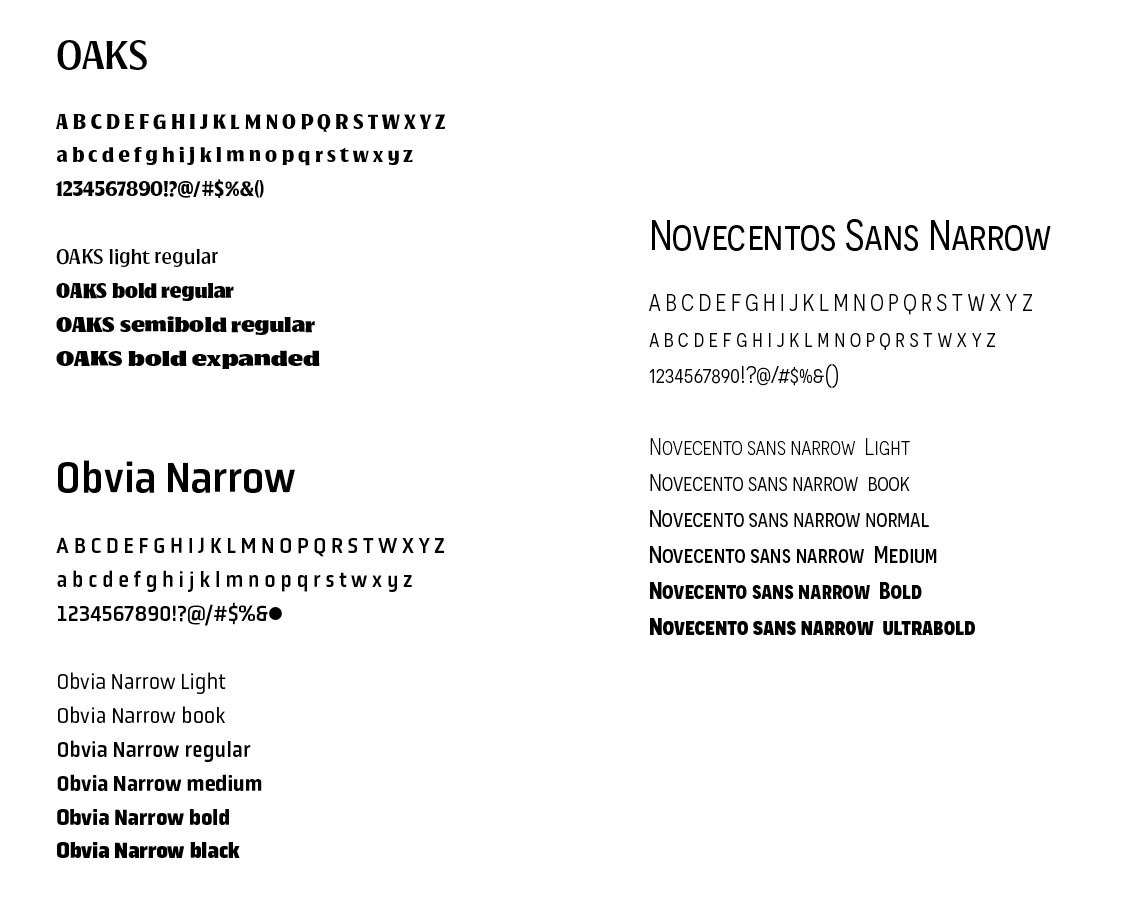 Para esta identidade, recomendamos: Oaks e Novecentos Sans Narrow para destaques, títulos e subtítulos e Obvia Narrow corpo de texto e outras informações secundárias.