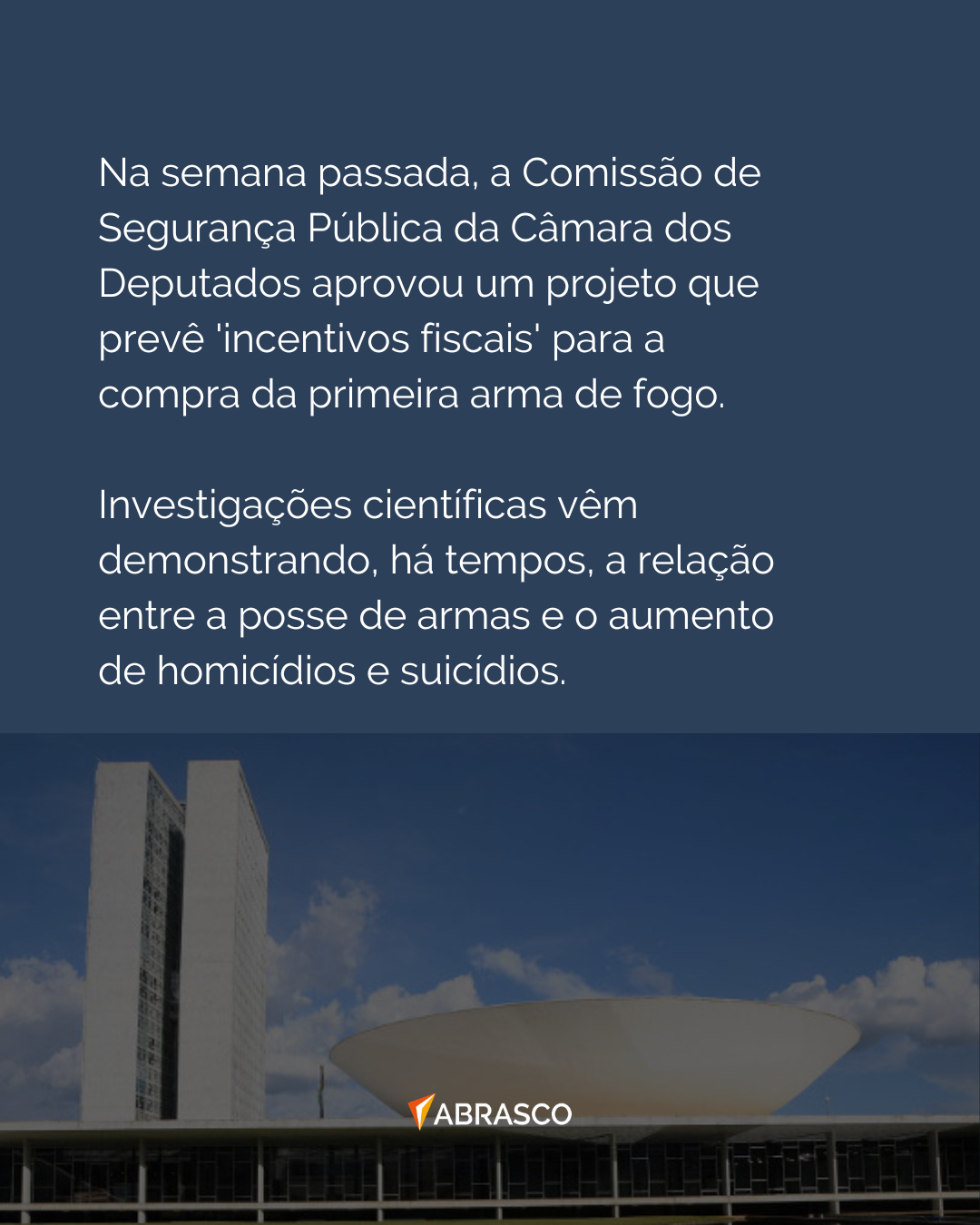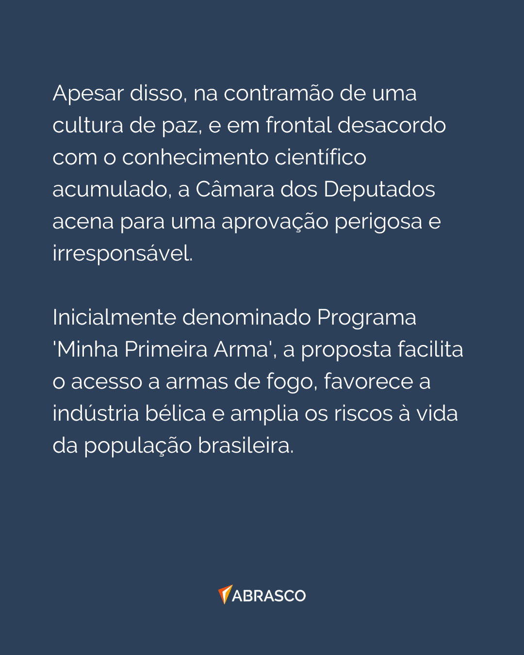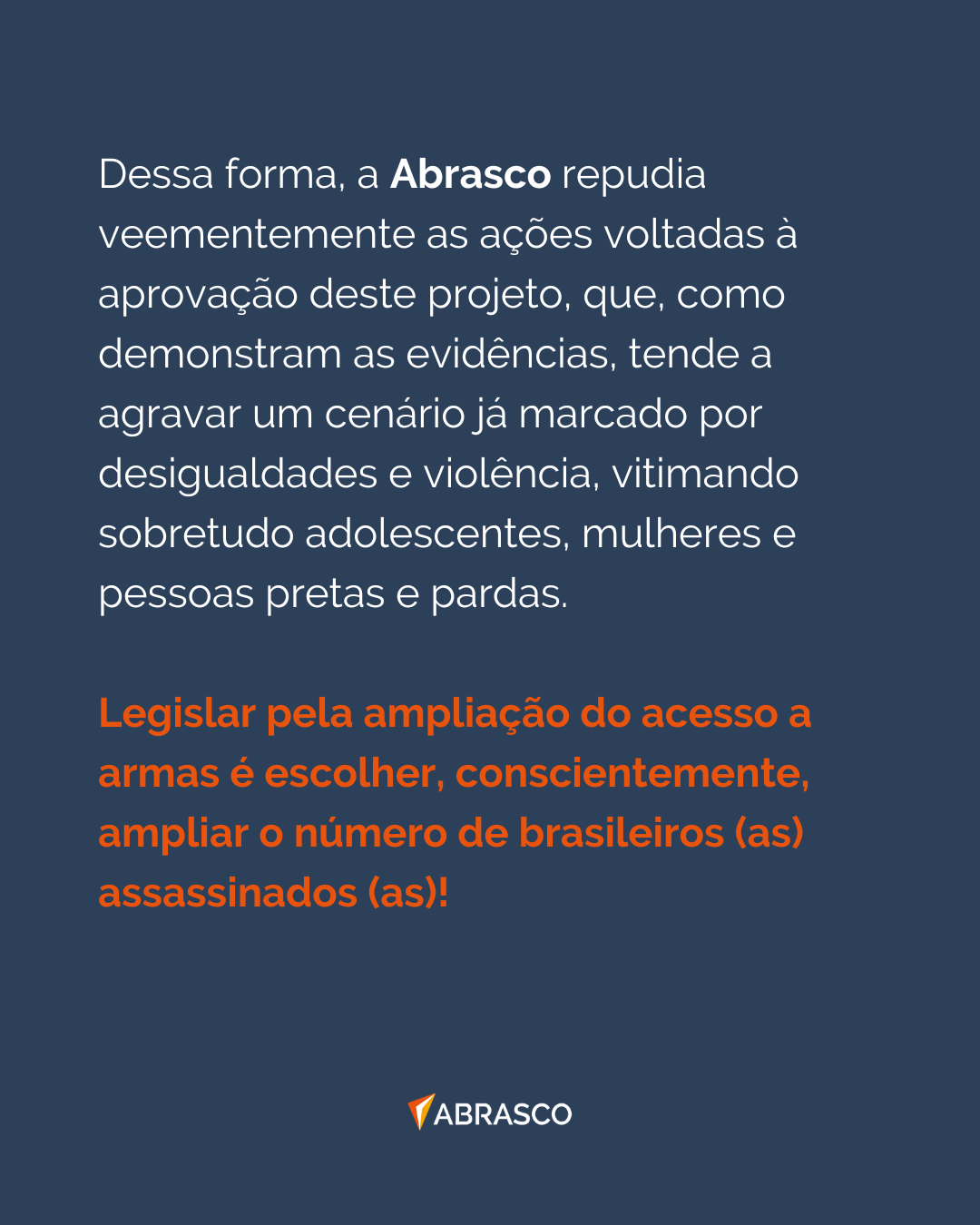 Diante desse cenário, a Abrasco, por meio do seu Grupo Temático Violência e Saúde (GTVS), repudia veementemente as ações voltadas à aprovação deste projeto de lei, que, como demonstram as evidências, tende a agravar um cenário já marcado por desigualdades e violência, vitimando sobretudo adolescentes, mulheres e pessoas pretas e pardas.