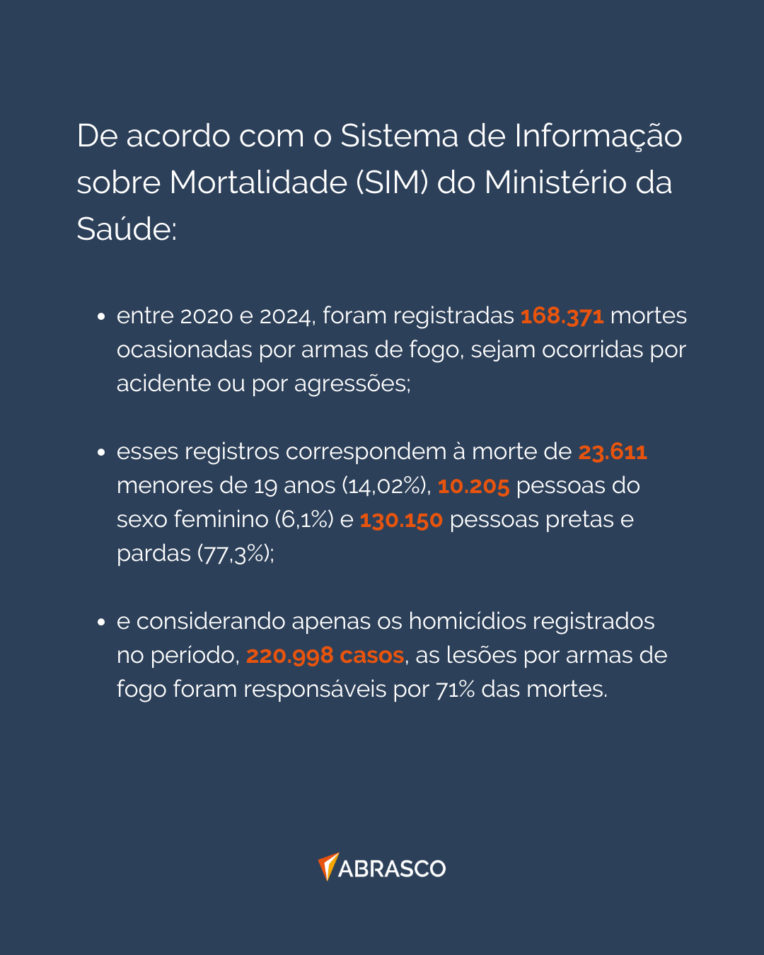 Entre 2020 e 2024, conforme dados do Sistema de Informação sobre Mortalidade (SIM), do Ministério da Saúde, foram registradas 168.371 mortes ocasionadas por armas de fogo, sejam ocorridas por acidente ou por agressões. Esses registros correspondem à morte de 23.611 menores de 19 anos (14,02%), 10.205 pessoas do sexo feminino (6,1%) e 130.150 pessoas pretas e pardas (77,3%). Considerando apenas os homicídios registrados no período, 220.998 casos, as lesões por armas de fogo foram responsáveis por 71% das mortes (n=156.955), sem contar as intervenções legais, que são aquelas geradas por forças de segurança. Os dados são explícitos em apontar que as armas de fogo são ferramentas que cumprem o papel para o qual foram concebidas: matar!