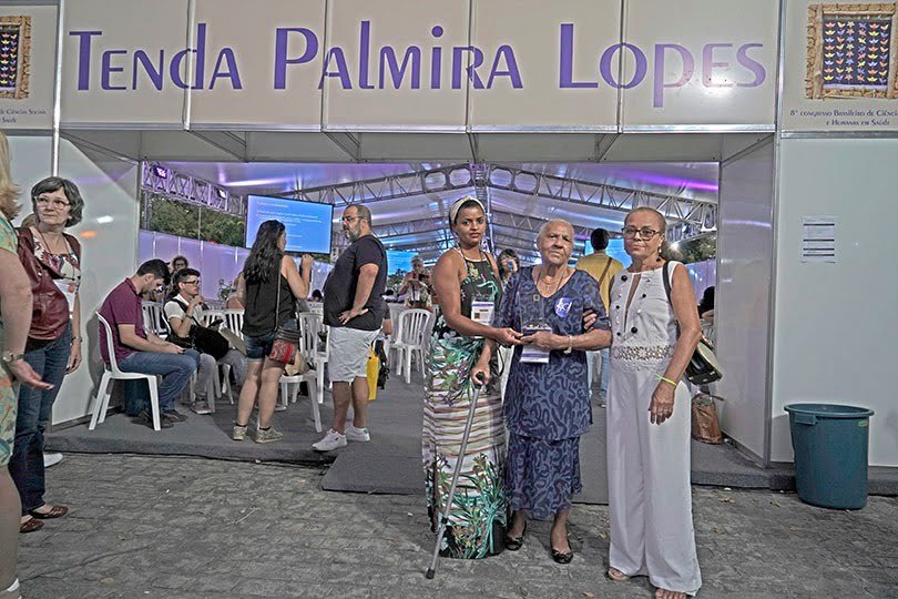 “Eu não quero levar esse saber só comigo” disse Dona Palmira Lopes. Estava bastante emocionada a educadora popular e liderança comunitária na Paraíba, uma das coordenadoras do Movimento Popular de Saúde, que mora atualmente no Assentamento Novo Salvador, no município de Jacaraú. Em seus agradecimentos, Palmira lembrou seu trabalho de integração entre os conhecimentos populares e os conhecimentos científicos na construção de processos de cuidado integral em saúde (em especial pela fitoterapia) e em ações de luta por direitos sociais e humanos para os grupos populares: – “Eu nunca procurei a Universidade porque eu sabia que não tinha condições pra isso… eu não fiz vestibular, eu tenho apenas o 5º ano primário. Comecei a trabalhar com plantas medicinais por causa da minha criação: eu fui criada assim e era muito procurada na minha ccomunidade para fazer remédio de planta. Um dia eu recebi um recado, a professora Rinalda (Rinalda Araújo Guerra de Oliveira, da Universidade Federal da Paraíba) queria falar comigo. Ela me perguntou no que a Universidde poderia me ajudar no meu trabalho na comunidade e eu pedi um retorno científico sobre meu uso de plantas medicinais, eu queria saber se o que eu fazia com os remédios era verdade… por exemplo, eu usava hortelã miúda para ameba, será que era verdade? Para mim, só a ciência da Universidade poderia me dar essa resposta. Professora Rinalda disse que me ajudava mas que não queria que isso ficasse só na Paraíba, então comecei a viajar por quase todo o Brasil e hoje estou aqui agradecendo por este conhecimento. Sabe, eu já estou perto de ‘viajar pra uma cidade sem volta’ e por isso estou escrevendo mais um livro, eu não quero levar esse saber só comigo.” contou Dona Palmira que também faz versos e foi com um deles que terminou cantando, e toda Tenda Palmira Lopes cantou com ela: “Oiê mulher daqui, oiê mulher de lá, pra resolver os problemas precisa se organizar… pra resolver os problemas precisa se organizar!”