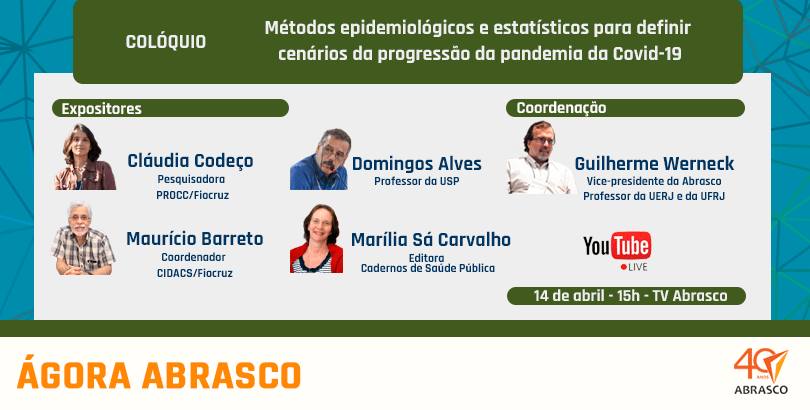 O primeiro será nesta terça-feira, dia 14, com o título Métodos epidemiológicos e estatísticos para a definição de cenários frente à evolução da pandemia da Covid-19. A coordenação será de Guilherme Werneck, vice-presidente da Abrasco e docente da UERJ e da UFRJ, e contará com as exposições de Cláudia Codeço, pesquisadora do Progama de Computação Científica da Fundação Oswaldo Cruz (PROCC/Fiocruz), Marília Sá Carvalho, editora dos Cadernos de Saúde Pública (CSP) e pesquisadora da Escola Nacional de Saúde Pública Sergio Arouca (ENSP/Fiocruz), Mauricio Barreto, coordenador do Centro de Integração de Dados e Conhecimentos para Saúde (CIDACS/Fiocruz-Bahia) e Domingos Alves, professor do Departamento de Medicina Social da Faculdade de the Medicina de Ribeirão Preto (FMRP/USP), com convidados de outros 10 programas de pós-graduação e centros de pesquisa.