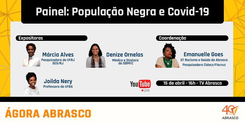 Na quarta-feira, dia 15, será a vez do painel População Negra e Covid-19, articulado pelo Grupo Temático Racismo e Saúde (GT Racismo/Abrasco) reúne Marcia Alves, técnica na Superintendência de Atenção Primária à Saúde da Secretaria de Estado de Saúde do Rio de Janeiro, técnica e pesquisadora na UFRJ; Joilda Nery, docente do Instituto de Saúde Coletiva da Universidade Federal da Bahia (ISC/UFBA); e Denize Ornelas, Diretora da Sociedade Brasileira de Medicina de Família (SBMFC). A coordenação será de Emanuelle Goes, pesquisadora do CIDACS/FIOCRUZ e do Instituto de Saúde Coletiva (ISC-UFBA).