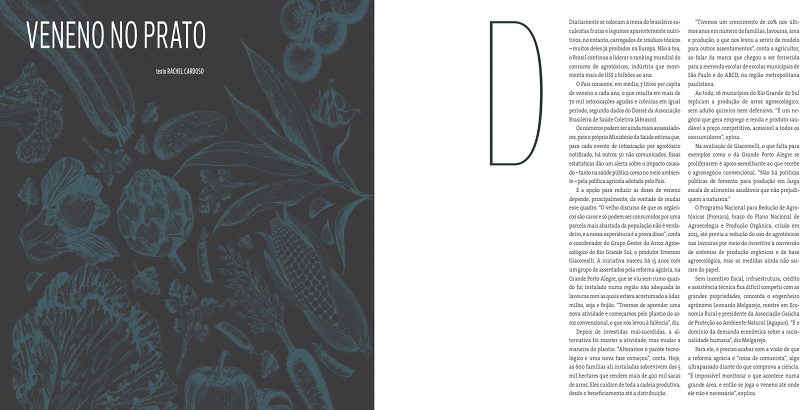 A Revista Problemas Brasileiros publicou este mês uma reportagem sobre o consumo de agrotóxicos no Brasil e seu impacto na saúde dos brasileiros. A matéria destaca dados divulgados pela Abrasco e que estão no Dossiê Abrasco: um alerta sobre os impactos dos agrotóxicos na saúde. Também foram ouvidos vários envolvidos no tema como a toxicologista Karen Friedrich, pesquisadora da Abrasco; o coordenador do Grupo Gestor do Arroz Agroecológico do Rio Grande Sul, o produtor Emerson Giacomelli; o engenheiro agrônomo Leonardo Melgarejo, mestre em Economia Rural e presidente da Associação Gaúcha de Proteção ao Ambiente Natural (Agapan); o coordenador da Campanha Permanente Contra os Agrotóxicos e Pela Vida, Alan Tygel; e o coordenador-geral de Agroquímicos e Afins do Mapa, Carlos Ramos Venâncio.